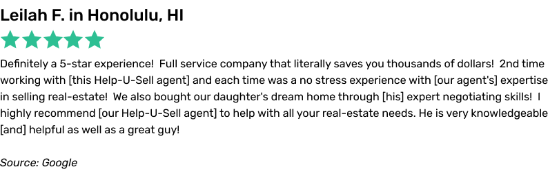 This review comes from a customer who has worked with Help-U-Sell Hawaii twice. She praised her agent's negotiating skills in securing a great deal for her daughter, and said that her agent was both knowledgeable and helpful.