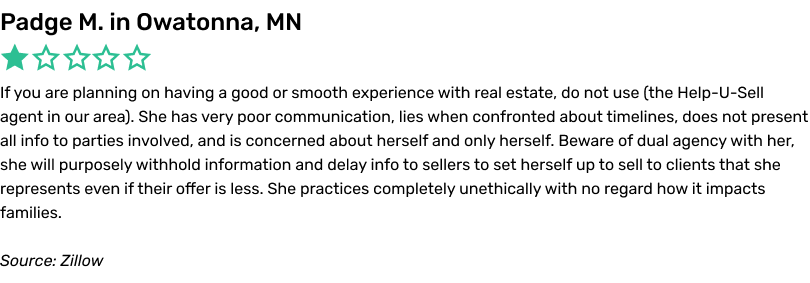This Zillow user had a poor experience with their Help-U-Sell agent in Owatonna, MN.