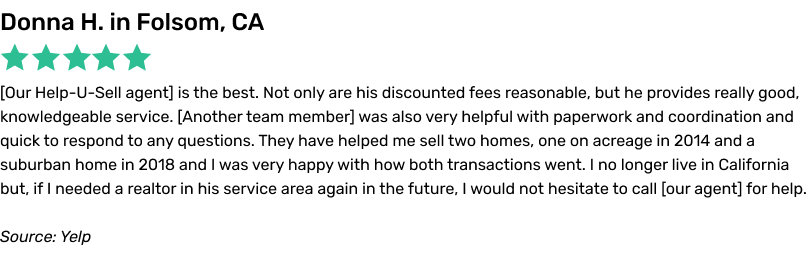Here's an example of a positive review on Yelp from a repeat seller who had a near-perfect experience with a Help-U-Sell office in Folsom, CA.